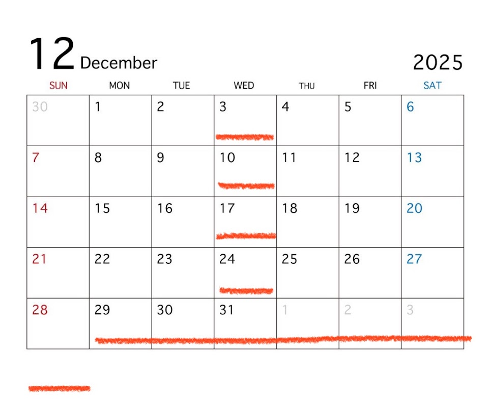 2025-12-06 レグ広島 12月休業日のお知らせ 水曜日が定休日です。年末年始は12/29(月)~2026/1/4(日)をお休みとさせて頂きます。レグ広島 株式会社レグ 未分類 No Comment